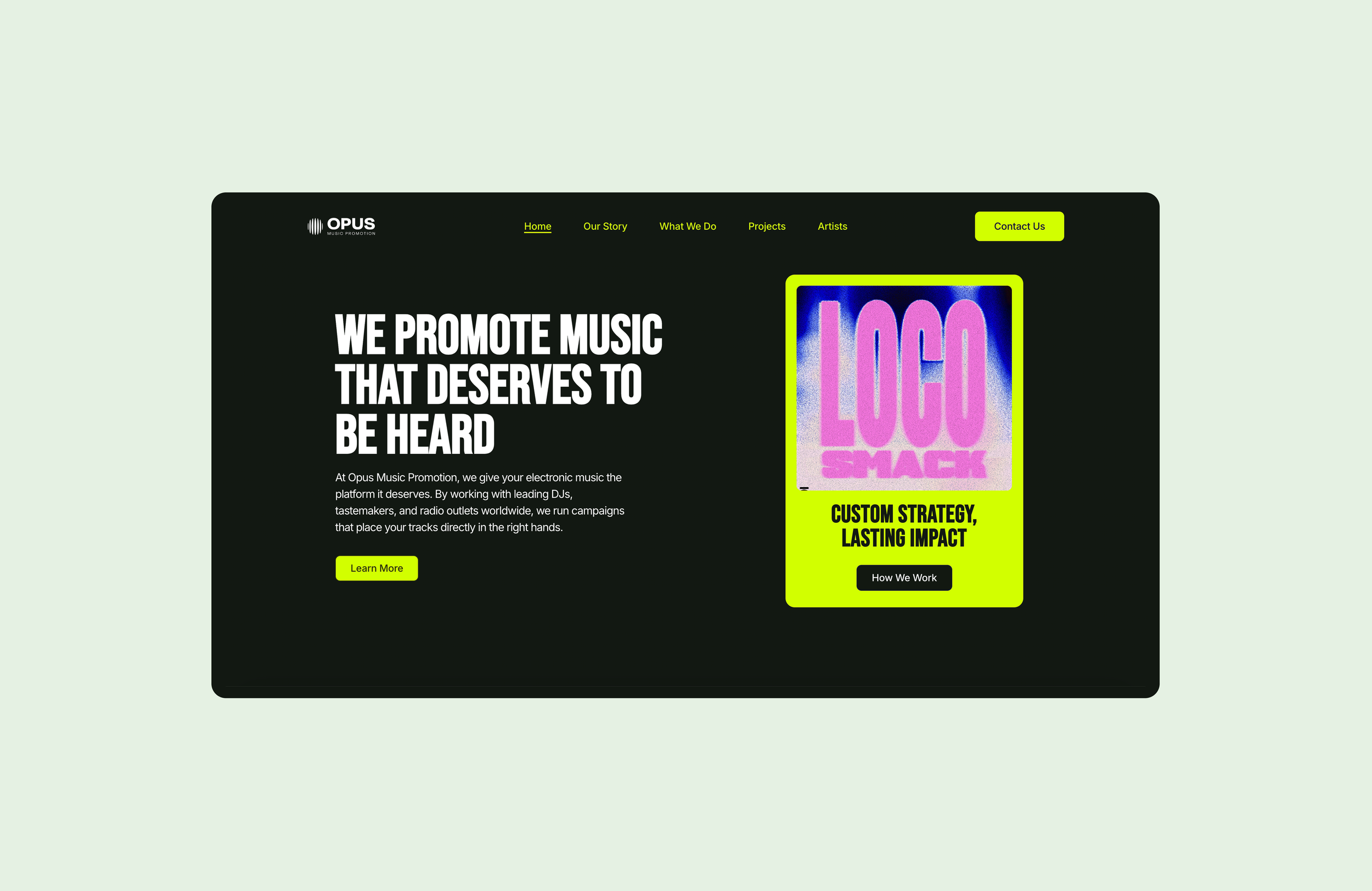 The music industry is a highly visual field where many different graphics and styles often collide, making websites feel cluttered and lacking a clear story. My challenge for the Opus website was to design and build a platform that communicates who they are, what they do, and showcases their roster of work in a clear and engaging way that appeals to industry professionals.