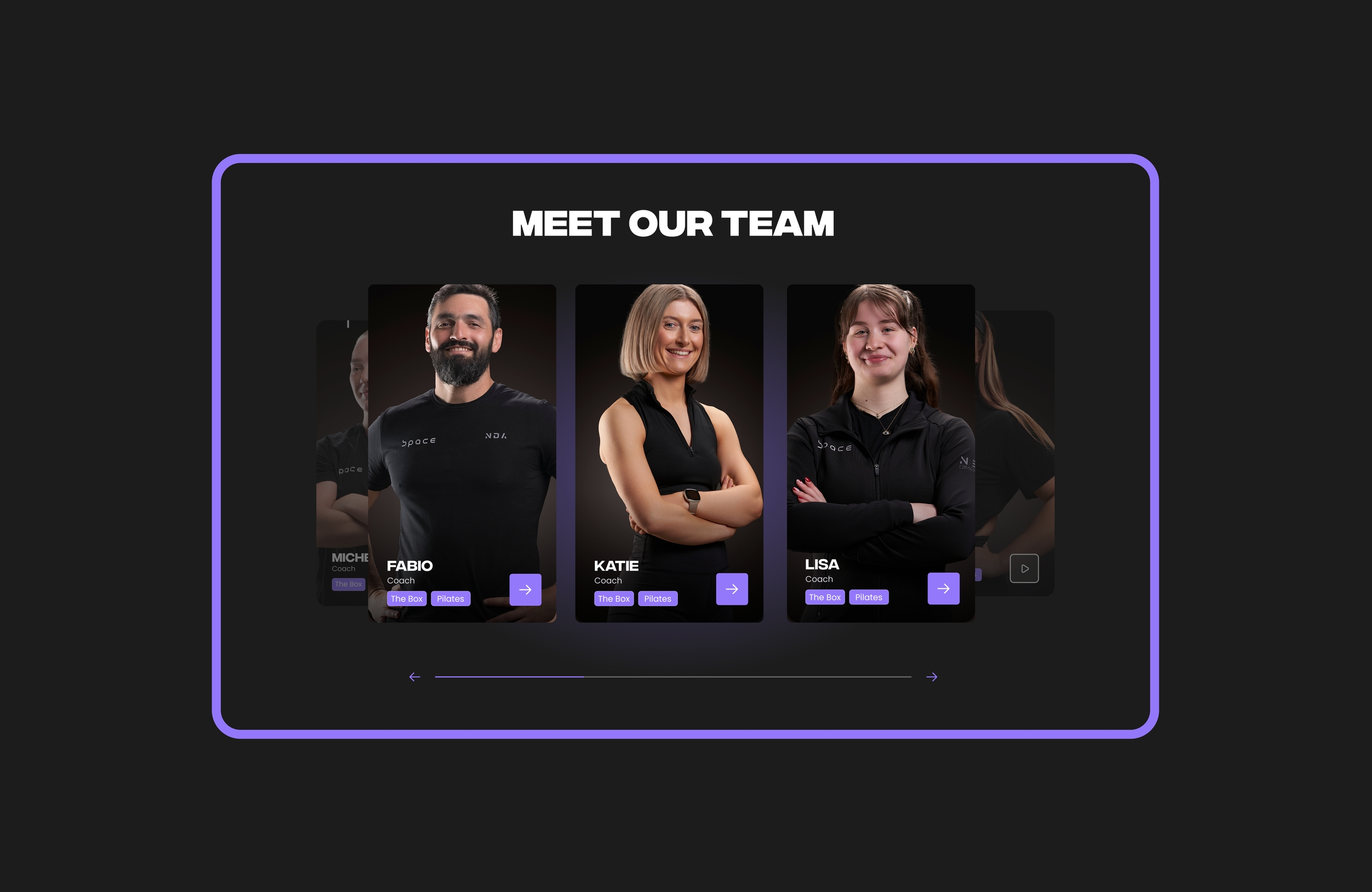 I used my creative freedom to direct the branding part myself, creating a solid ground to start the technical design from. Settling on a bold typeface seemed the perfect fit for the story of Space Gym with statements like; ‘THIS IS SPACE’ and ‘ENERGIZE, CONNECT, BELONG’ this only seemed right. The mostly dark mode design is supported by gentle animations in buttons and soft gradients to add depth, movement, and a calm, pleasant feel to the experience. Whether you’re looking for a specific class or instructor, visitors are guided by helpful tags that show which instructor teaches each class and what type of workout it is. A booking feature was integrated into the website, allowing visitors to schedule a gym tour or sign up for a workout class. The booking system itself is managed externally by a third-party provider based in Ireland. My role focused on designing the interface and ensuring smooth redirects to the external booking platform. I had a lot of fun working on this project as it was my first project from outside of The Netherlands. Getting to present my design in English was something out of my comfort zone, but nothing I could not handle as I was surrounded by the best team. Resulting in a website that perfectly collected the vision of Space-Gym.